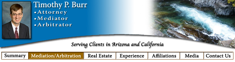 In addition to serving as a court appointed arbitrator in numerous cases, his alternative dispute resolution experience includes serving as a member of the American Arbitration Association Commercial Mediation and Commercial Arbitration Panels, as a mediator for the Arizona Association of Realtors, on the State Bar of Arizona legal fee arbitration panel, and as a volunteer mediator for the Office of the Arizona Attorney General and the Maricopa County Justice Court. Mr. Burr is a former full time member of the faculty at Arizona State University School of Law and served as the Director of the Mortgage Mediation Program.